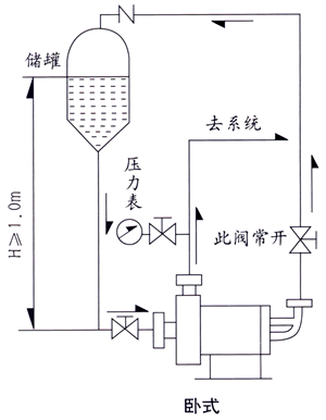 4、泵吸入管的安装高度、长度和管径应满足计算值,力求短、直、管径大、减少不必要的损失,并保持在工作时不超过允许的汽蚀余量,对所输送的液体,汽蚀较大(如氨氟等),其安装高度应保持液体最低液面至泵的基准线在H值以上,如下面电泵安装示意图。